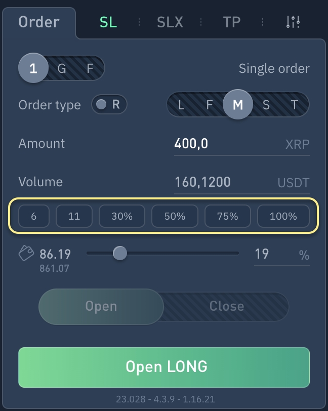 If a percentage is specified, then clicking the button will insert Order volume as a percentage of the Free wallet balance.