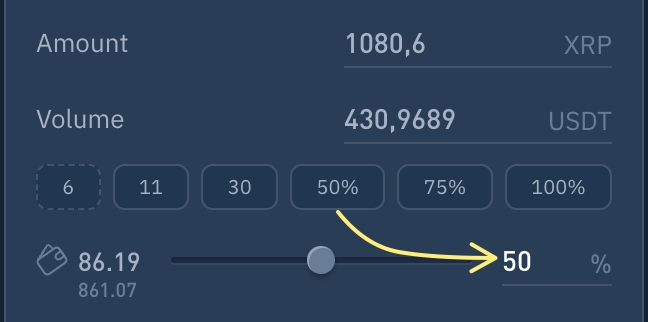 Clicking the button will insert the specified token volume (USDT) or amount.
