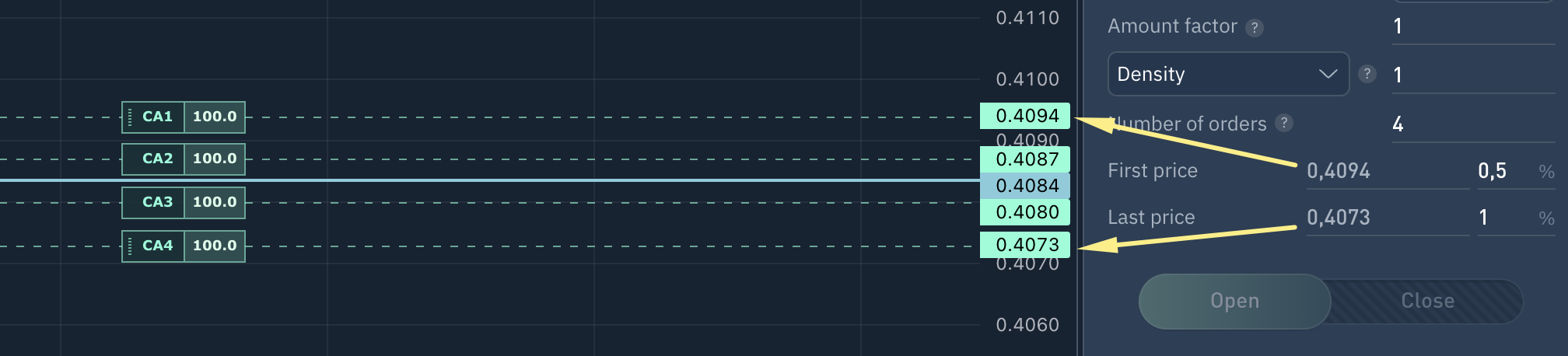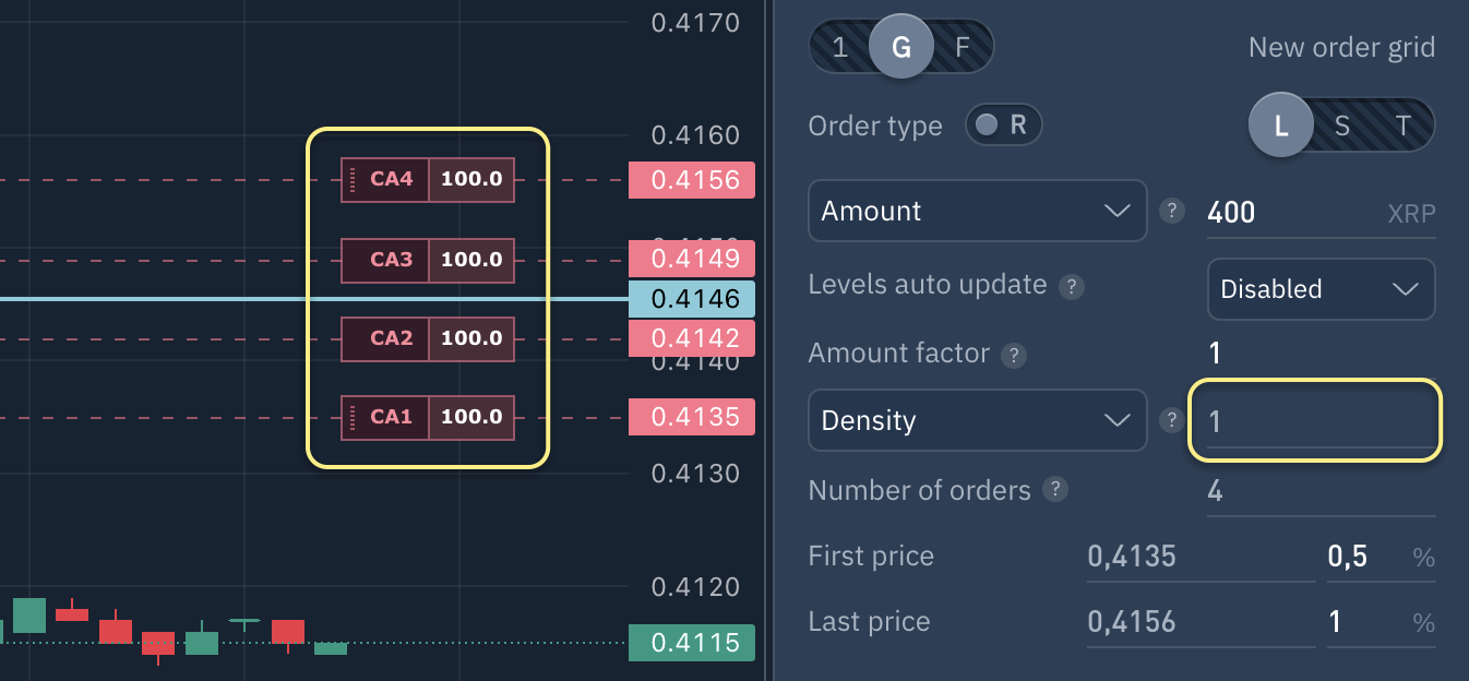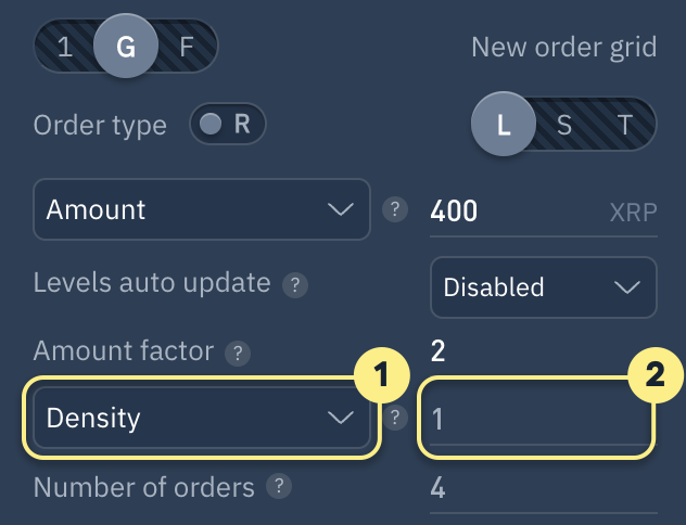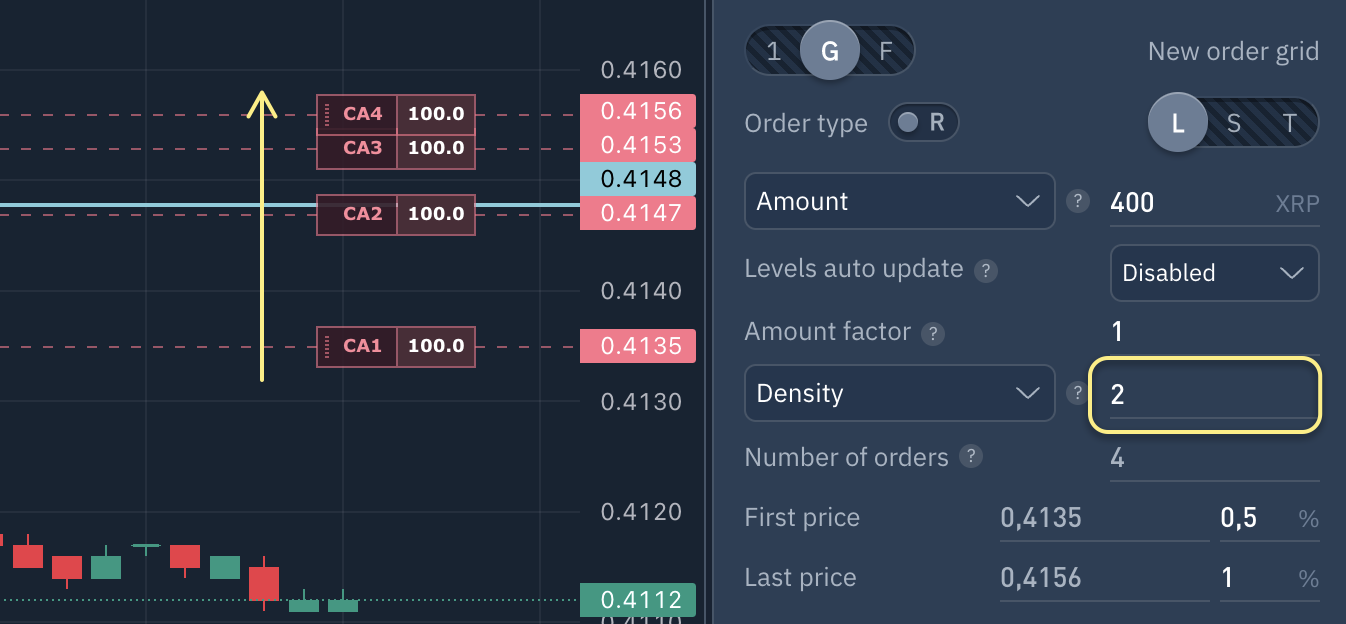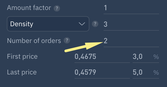 If 'Density' is selected and set to 1, orders will be evenly distributed in the grid. If set to a value greater than 1, orders will be concentrated closer to the grid´s end, and if less than 1, closer to the beginning.