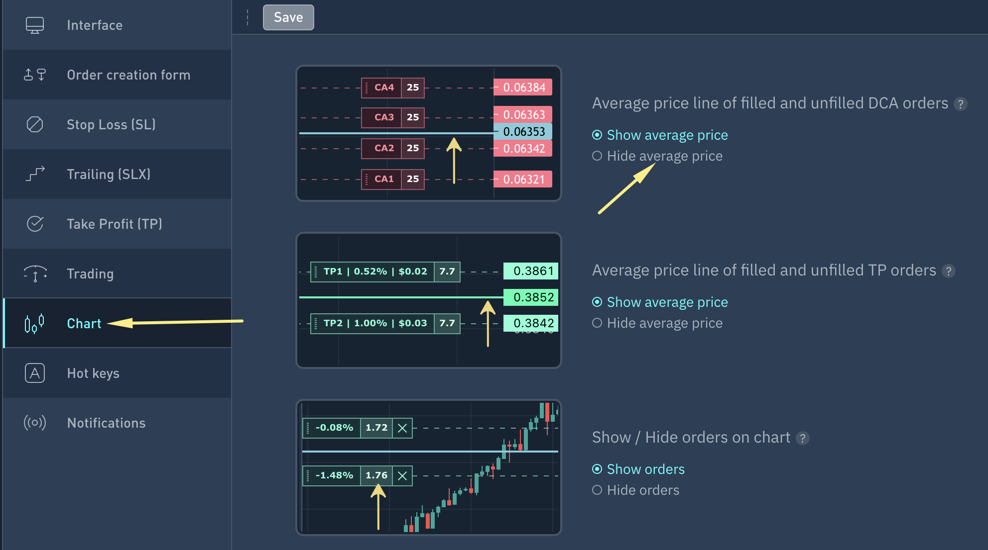 Position's average price when all grid orders execute is shown. Grid's middle line can be hidden in settings.