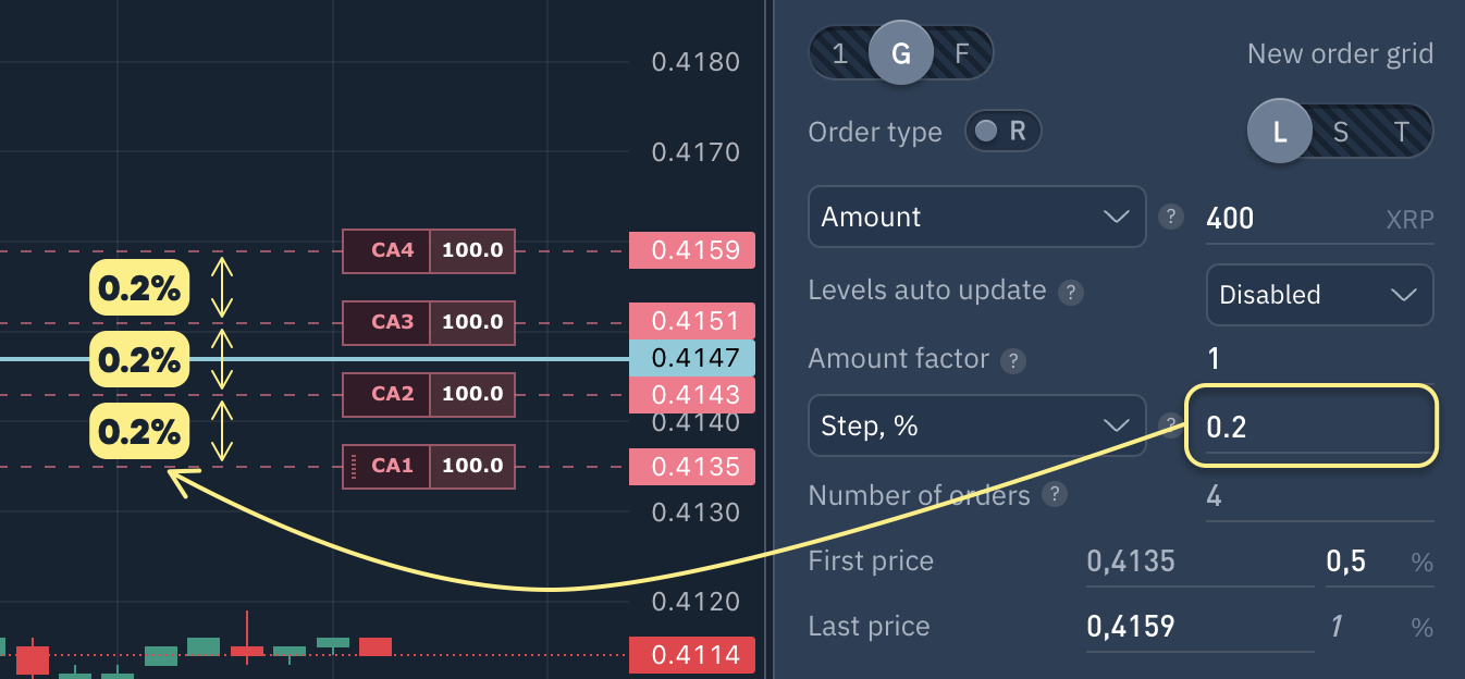 When 'Step in %' is selected, Grid orders will be placed with a distance equal to specified percentage.